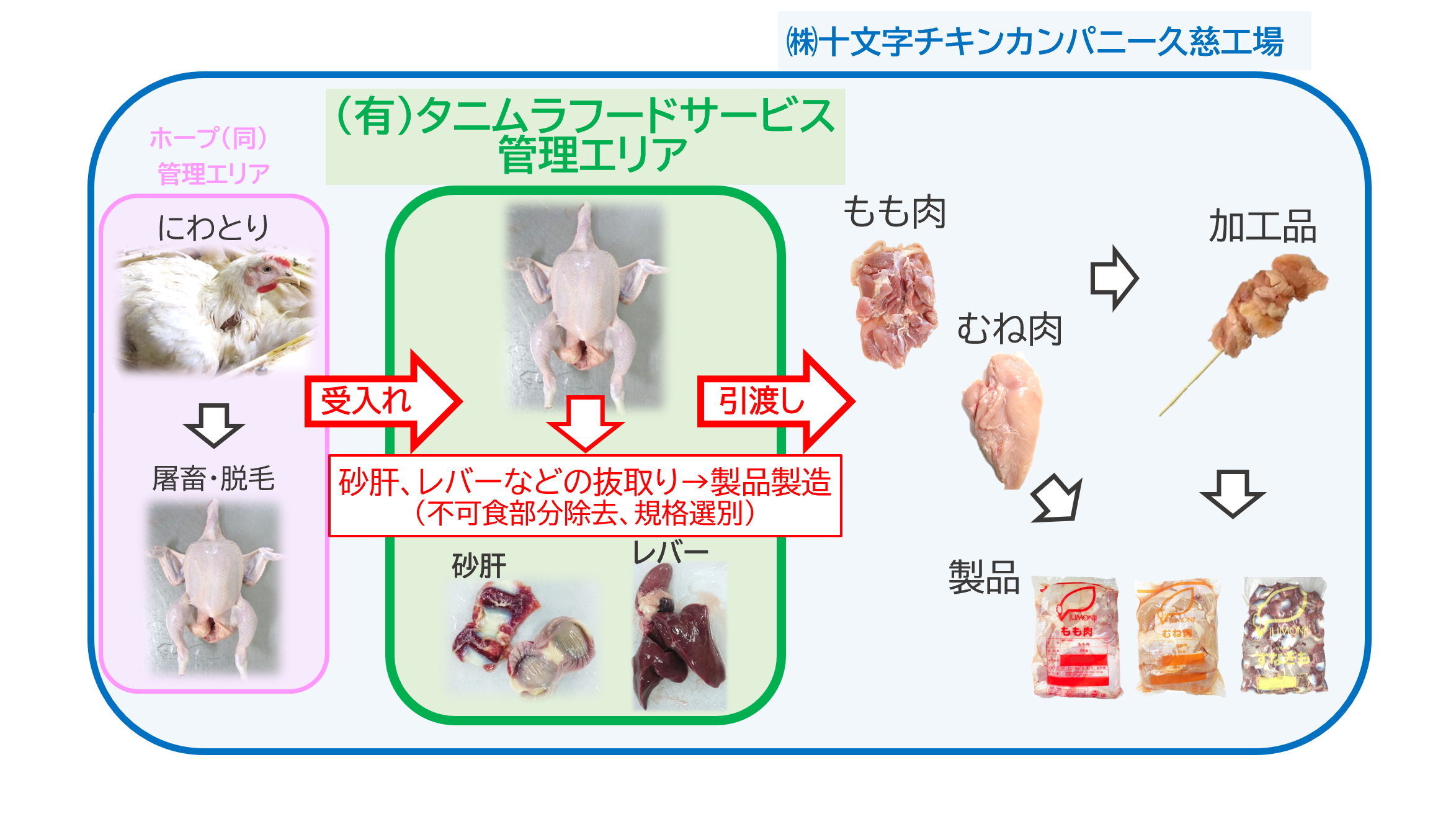 ㈱十文字チキンカンパニー久慈工場(青枠)の工場内にあります、弊社の管理エリア内(緑枠)に、弊社同様に協力会社であるホープ(同)の管理エリア内(桃色枠)にて屠畜、脱毛処理を施した屠畜体を受入れます。弊社管理エリア内では、製造ライン機械によって屠畜体から内臓を抜取り、機械と手作業で砂肝や肝(レバー)などをそれぞれの部位に別け、不可食部分の除去や規格に従った選別などの製品製造を行います。その他にも屠畜体から首周りの皮や脂なども分離し同様に製品製造を行います。製造した各部位や次工程に向けて準備を施した屠畜体を㈱十文字チキンカンパニー久慈工場に引渡します。